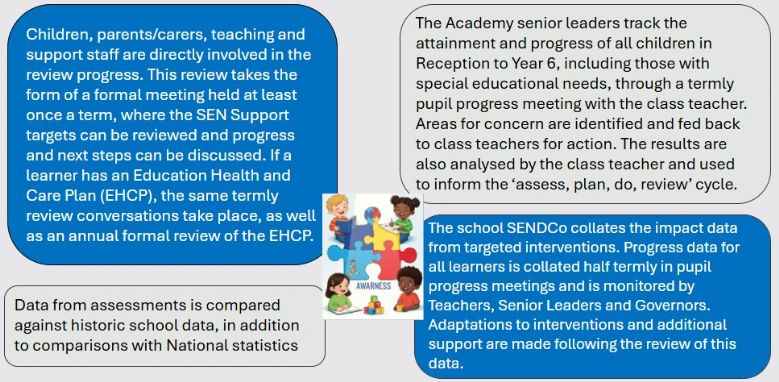 All pupils with SEND have individual targets relating to their areas of need. Parents/ carers are informed of these via the Support Plan review process and at Parent/carer consultation sessions.