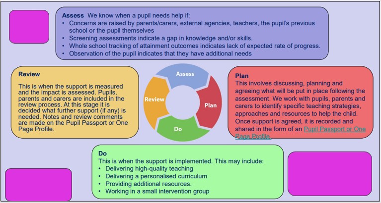 If a learner is identified as having SEND, we will provide provision that is ‘additional to or different from’ with the intent of overcoming their barriers to their learning. We follow the SEND Code of Practice Graduated Approach/Response, so-called as it may take several cycles of intervention and different strategies being tried before support needs are understood and met. It involves regular meetings with the child and parent to monitor, assess and review progress and outcomes.